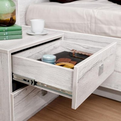 Прикроватная тумба NEO 41 с двумя выдвижными ящиками и высокой мягкой спинкой – красивый и функциональный модуль. Изюминка тумбы - комбинированная задняя стенка, возвышающаяся над столешницей: ее нижняя часть из ЛДСП, а верхняя с подушечкой из экокожи цвета Асфальт. Когда тумба приставлена к кровати, тогда она составляет единую композицию с изголовьем. Дополняют тумбу интересные ручки на ящиках: в обычном состоянии - это плоские прямоугольные кнопки, а при необходимости выдвинуть ящик средняя часть приподнимается кончиками пальцев.